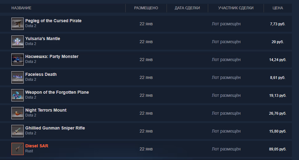 Steam Market селлер — софт для автоматической продажи предметов на Торговой площадке Steam. Поддерживает любые игры Steam, включая карточки, достаточно указать ID игры в конфигурации. Выставляет предметы на продажу, отслеживает цены конкурентов и автоматически перебивает их, удерживая ваши лоты на первых позициях. Гибкая конфигурация позволяет настроить софт под практически любую концепцию торговли.